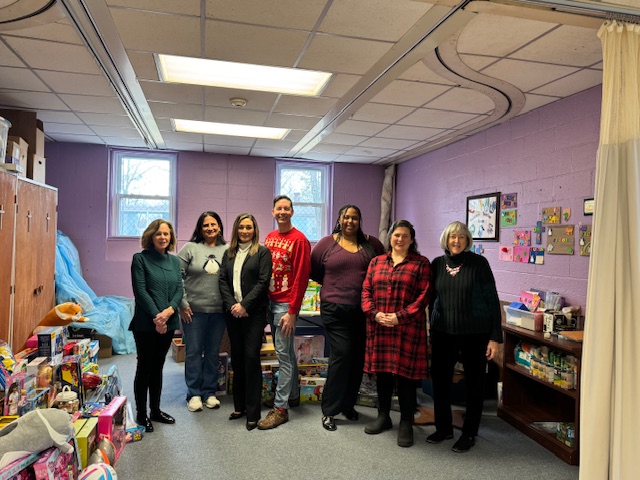 (left to right) Laurie Robinson, RIFDA Executive Director, Maria King, RIFDA Immediate Past President, Nicole Heywood, RIFDA President, Ryan Loiselle, Program Director of Friends Way, Sophia Baptiste, MEd, Program Supervisor of Friends Way, and Friends Way Volunteers shown with generous RIFDA donations from the Second Annual 2025 Toy Drive.